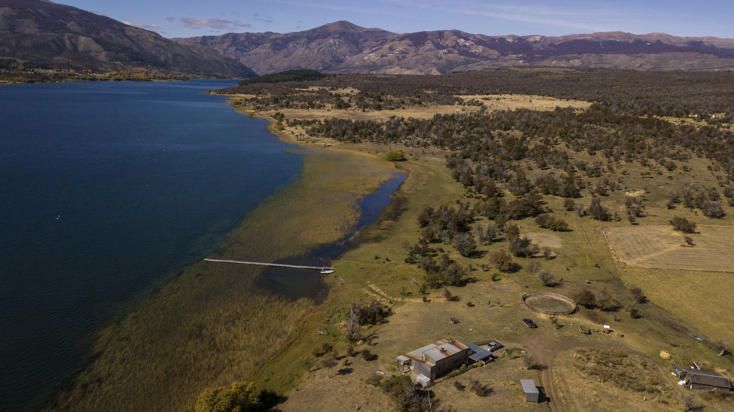 El terreno presenta suaves pendientes que potencian las vistas abiertas al lago y a los cerros circundantes, generando escenarios panorámicos de gran impacto visual. La vegetación es autóctona, con predominio de ñires y maitenes, acompañados de amplias áreas de pasturas naturales que realzan el carácter patagónico del lugar.